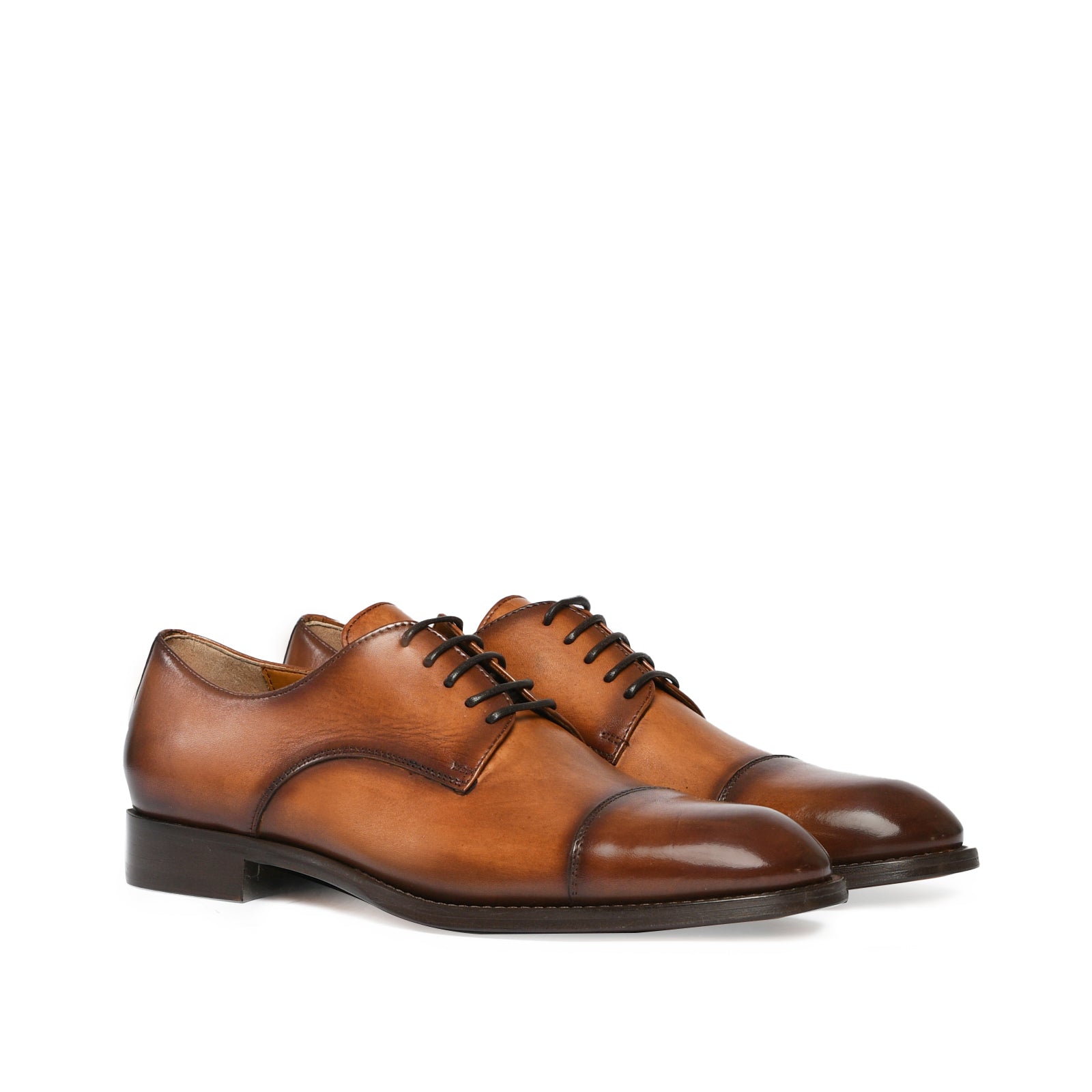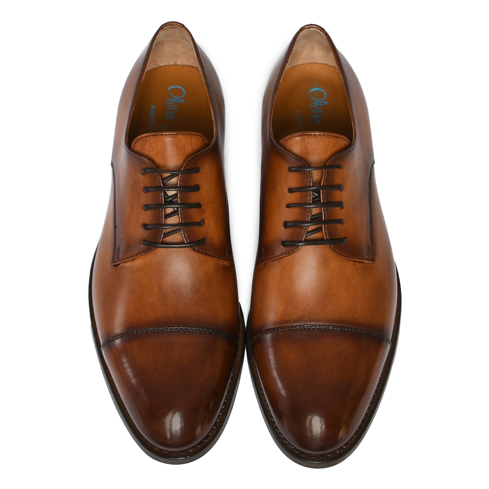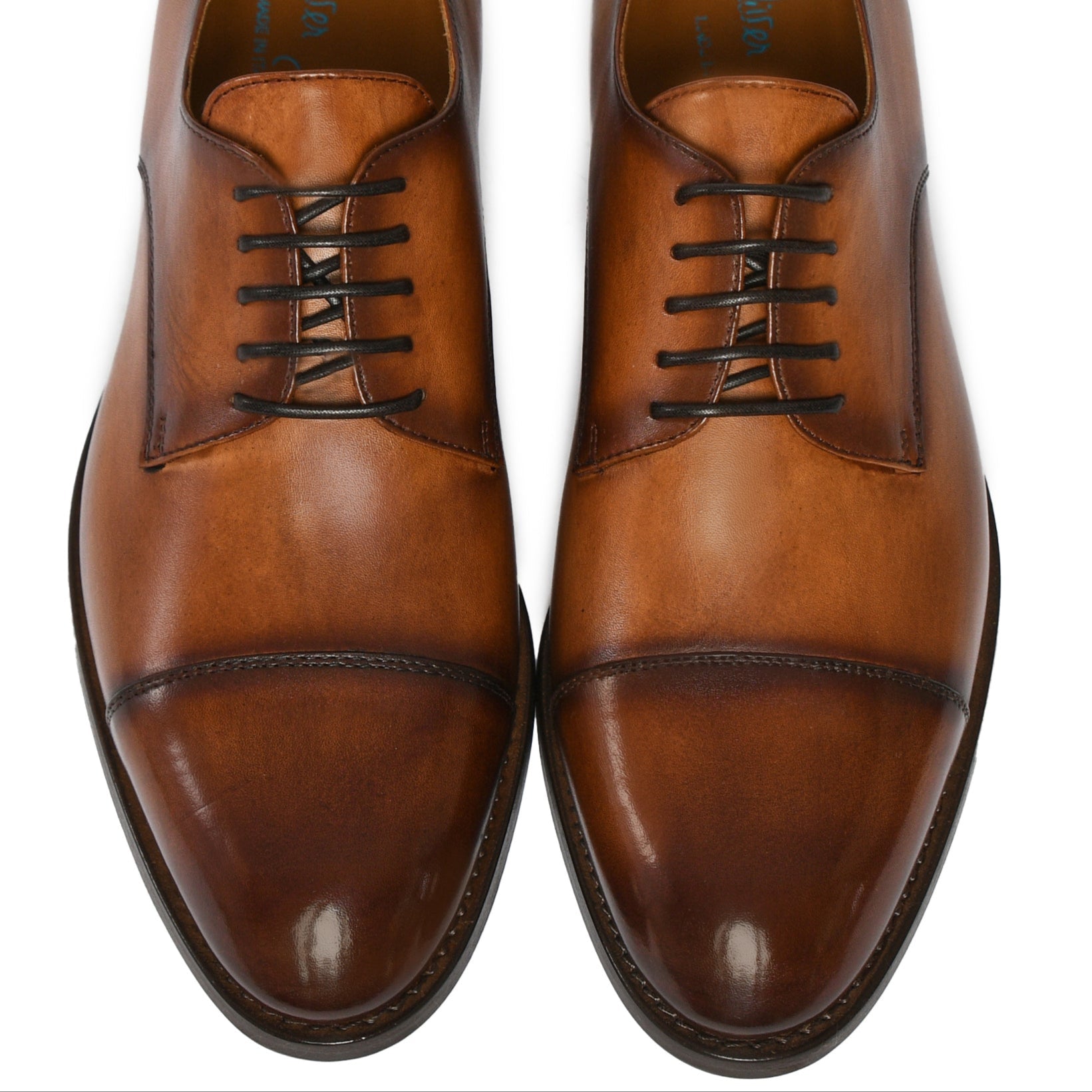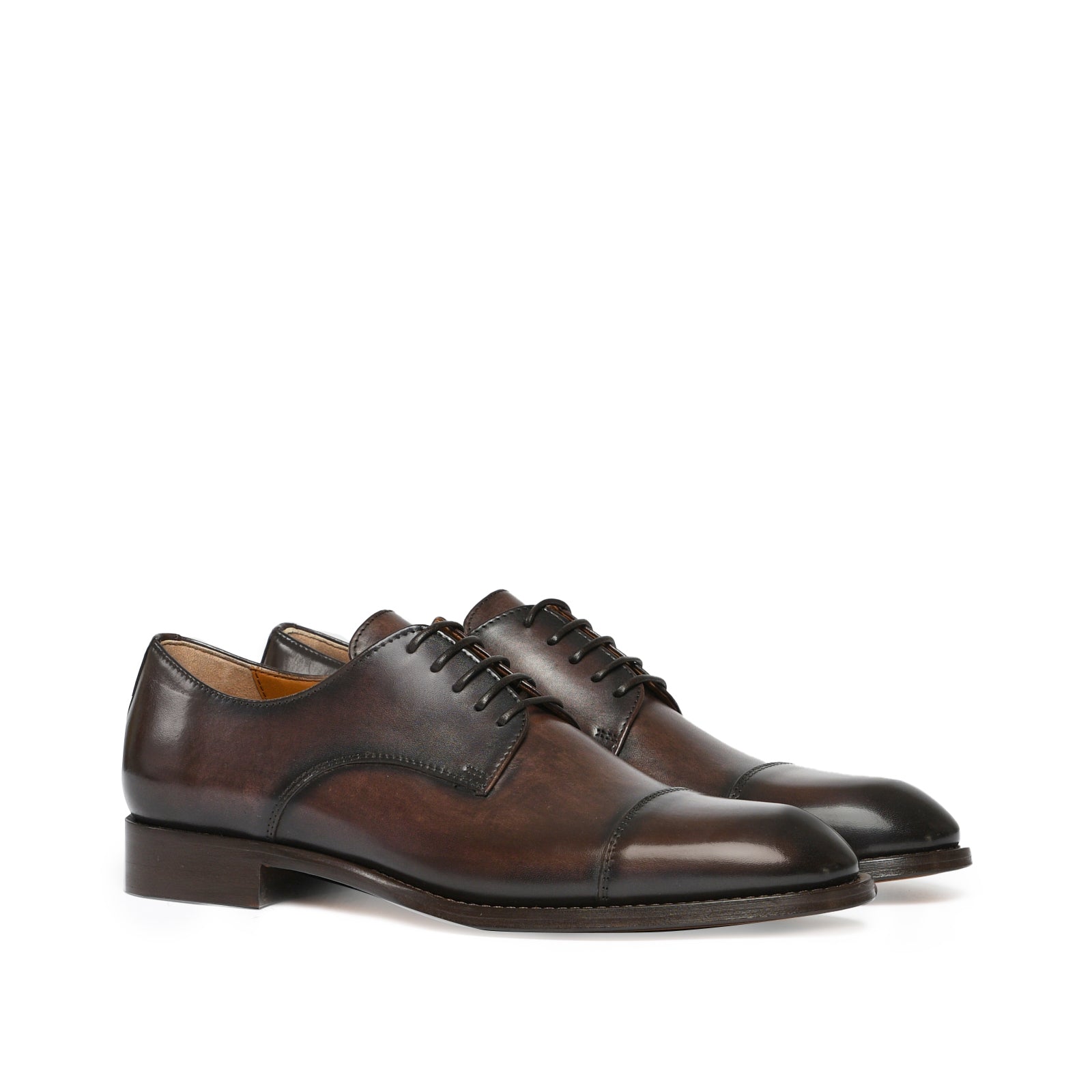 Il risultato finale di un processo meticoloso: una scarpa raffinata, dalla patina sfumata realizzata a mano, simbolo di qualità, tradizione e stile senza tempo.